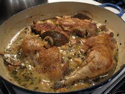 Scatter garlic cloves over the bottom of a casserole dish. You can use a flat dish if you want more crispy skin, or a deep dish if you want softer, juicier chicken. Place chicken pieces over the garlic, skin side up. Sprinkle the chicken with wine, juice or stock, oil, seasonings and herbs. Cover the dish tightly with foil (and a lid if it has one) so no steam can escape. Bake at 350 degrees for 1 1/2 hours. Remove lid and foil, and return to the oven to brown for another 15 minutes. Discard bay leaves.
